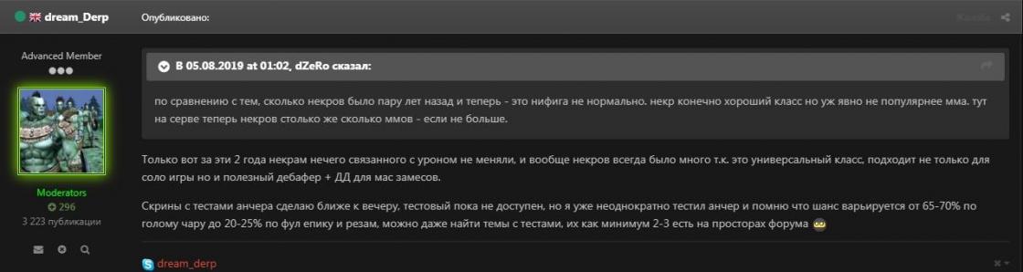 как можно считать багом то, что у вас серверно прописан высокий шанс прохождения анчора? если пройтись по хроникам то можно заметить, что анчор довольно долгий период времени был не изменным. при переходе с интерлюда на камаэль хроники Анчор не меняли. что свидетельствуют записи на гохе о изменениях в камаэль хрониках - ссылка https://forums.goha.ru/showthread_0_0_t156070--ММО+Игры+LINEAGE+2+Lineage+2+Main+Цикл+обновлений+Awakening+Архив+обновлений+The+1stThrone+The+Kamael+PTS+Patch+Notes если быть точнее то вот после идёт грация в которой скилл так же не изменялся- с подробным писанием скила. и только на ХФ скил притерпел изменения в виде повышения шанса прохождения но снижения действия дебафа (5сек). а так же добавлением других эффектов полную хронологию собрать просто не реально как не крути. но очевидно, что данный скилл существовал в 2х версиях - с маленьким шансом прохождения но длительным эффектом. либо с более высоким шансом прохождения но с менее длительным эффектом. Вы верно говорите - любое изменение повлечёт за собой последствия. чем конкретно некр станет хуже если ему уменьшить шанс прохождения анчора? я уже писал выше - у некра остаёться ещё приличный асортимент дебафов - сало,дум,абус, 2 масс бана. некр являеться уникальным классом благодаря именно большому асортименту дебафов а не наличием 1го убер дебафа. не говоря о том, что при использовании ЦДЛ анчор как таковой вообще не используют. Допустим вы ничего не будите менять и всё останеться так как есть. Как быть с теми кто не попадает под ваше понятие баланса? Я игрок вашего сервера играющий за дагеров - как быть мне и многим другим кто играет за дагеров? или быть может мы как-то не достойны играть на сервере с комфортом? т.е по сути вы мне говорите, что изменение второстепенного скила у некров (анчора) повлечет огромные последствия. при этом уверяете, что блафф который не точиться и имеет статус стана из-за чего в итоге шанс прохождения блафа становиться ниже чем у анчора - это очень комфортно для дагеров? при том, что на блафе завязаны все атакующие абилки дагеров? Я в этом топике приводил пример такой "комфортной" игры в которой из 20 блафов не один не прошел- по проточеному чару с эпиком. на тех же скринах на фоне некр с +16 ам тестил анчор.