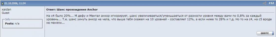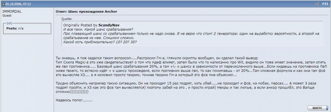 т.е в принцыпе если написать, что всё хорошо то это сразу и без оговорочно является правдой? а если говорить обратное то можно смело игнорить все данные тестов, данные с патч ноутов, данные с баз данных с описанием скилов выше хрониками + с обсуждениями из 2006 года на гохе и о том, что шанс анчора базовый был 20% ? что подтверждается и хрониками выше на которых шанс так же 20%. при настройке анчора откуда бралась инфа,что базовый шанс должен быть ~50% ? не с потолка же брали надеюсь.