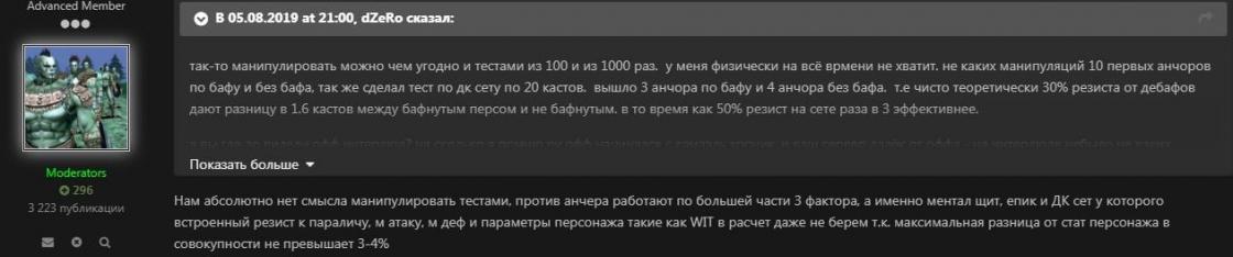 а как у вас вышло простым снятием бафа сделать шанс прохождения ниже? т.е по фул бафу 40% а по нг и без бафа 20? О_о с фул эквип - так только дк и эпик дают влияют на анчор не? как это могло повлиять на любой другой шмот или его отсутствие? как у вас вышел шанс в 18% если т.е у вас вышли результаты по персу в нг шмоте и без бафа ещё ниже чем по фул бафу,дк и эпику? О_о сдаёться мне либо я туплю либо вы проводите тесты на совершенно разных серверах. даже если предположить, что 65-70% это +13 анчор по голому персу то отняв эти +13 мы получим базовый шанс т.е +0 анчор. так же если верить модератору то разница всего в 4% которые даёт собственно резист за счёт статов персонажей. я вот честно хз как вы тестите если у вас даже при тесте одного и того же скила такой дичайший разброс в % прохождения.
