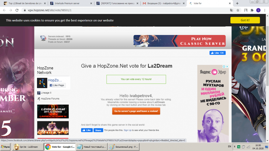 Голосую на hopzone через vote захожу обратно на сервер нажимаю получать бонус пишет проголосуйте, сколько раз не пробывал пишет вы не голосовали в игре, в бразле все хорошо, а на нетворке немогу вообще зайти но я думаю это тех ошибка самого нетворке. Почему не получаю бонус hopzone