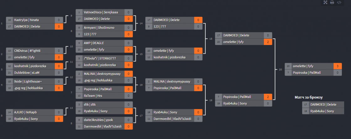 ENGLISH Congratulations to the Winners! 1st place - omelette l fyfy 2nd place - Papiroska l PallMall 3rd place - DARMOED l Delete 4th place - Ryab4uku | Sony Thanks to the all GvG participants! РУССКИЙ Поздравляем победителей! 1-ое место - omelette l fyfy 2-ое место - Papiroska l PallMall 3-ие место - DARMOED l Delete 4-oe место - Ryab4uku | Sony Спасибо всем командам за участие ! Standings - https://challonge.com/ru/La2DreamGVG9x9Tournament300120 Stream replay - p.s. Некоторые участники турнира попали сразу во второй тур и не все поняли почему так произошло, вынужден объяснить и в будущих турнирах это тоже будет объясняться уже в первом посте темы, чтобы больше не было подобных вопросов. Так вот, Для того чтобы сетка сошлась идеально нужно определенное количество команд, а именно 4,8,16,32,64 и т д, если команд например 21, или любое другое количество кроме 4,8,16,32,64, то не всем участникам хватает соперников. Например имеем 21 команд участников (как на данном турнире) , то-есть 10 пар по 2 и 1 лишний, но даже если-бы было 20 или 22 то во втором туре осталось бы 10 ( или 11 ), а в третий тур бы перешли 5 команд или 5+1 лишняя, что приводит всю турнирную таблицу в тупик т.к. не хватает соперников для финальных боев. (т.к. 5 на 2 ровно не делиться, как и 3 на 2 ровно поделить нельзя). Турнирная таблица которой мы пользуемся для организации турнира ( https://challonge.com/ ) автоматически формируется исходя из количества участников, то-есть она на перед просчитывает нужное количество раундов, а команды у которых нет соперников в СЛУЧАЙНОМ порядке автоматически переходят во второй тур, делаю акцент на том что это делается именно в случайном порядке и на стриме (таймкод 1:12:35) перед началом турнира видно как я нажимаю кнопку "Случайное ранжирование команд". Альтернатив этому только 2, либо формировать турнир строго по количеству 4,8,16,32,64 и.т.д, либо добавлять команды уже в процессе турнира что хуже т.к. это уже не случайность, а вмешательство. Надеюсь я ответил на все вопросы по поводу турнирной таблицы и в будущем таких вопросов больше не будет. Еще раз всем спасибо за участие! Увидимся на старте