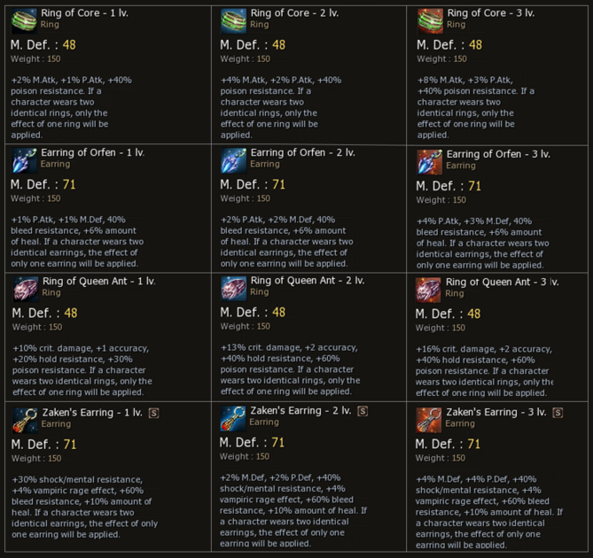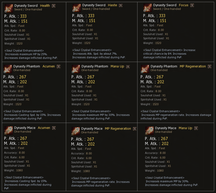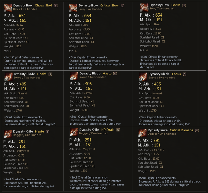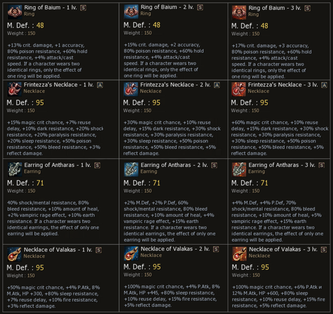 New items description on x500 \ Описание новых предметов на х500 Аvailable currencies \ Доступные валюты : Victim's Skull: With a certain chance to be obtained in special zones for killing other players in PvP, necessary for buying Dynasty weapons, armor and jewelry. Also can be obtain on Primeval Isle from Tyrannosaurus and Pterosaur. С определенным шансом добываться в специальных зонах за убийство других игроков в PvP, необходимы для покупки Dynasty оружия, доспехов и бижутерии. Так-же можно получить на Primeval Isle с Tyrannosaurus и Pterosaur. Epic Fragment: Dropped from all Raid Bosses, allowed to purchase Epic Jewerly 1 lv. from NPC "Shop". Падают со всех Рейдовых Боссов, позволяют приобрести Эпическую бижутерию 1 lv. у NPC "Shop". Festival Adena: Dropped from champion monsters, allows to purchase Dynasty and many others useful items from NPC "Shop". Падают с монстров чемпионов, позволяют приобрести Dynasty и множество других полезных предметов у NPC "Shop". Champion Coin: Dropped from champion monsters, allows to purchase one buff from NPC "Buffer" from premium section. Падают с монстров чемпионов, позволяют приобрести один баф у NPC "Buffer" из премиум раздела. Dynasty armor sets: Price for whole set \ Цена за весь сет = 15.000.000 Adena; 150 Festival Adena; 150 Victim's Skull. Dynasty Robe Set: Dynasty Heavy Set: Dynasty Light Set: Dynasty Jewerly: Price for each item \ Цена за каждый предмет = 3.000.000 Adena; 30 Festival Adena; 30 Victim's Skull. Dynasty Weapon: Price for each item \ Цена за каждый предмет = 10.000.000 Adena; 100 Festival Adena; 100 Victim's Skull. Epic Jewerly: Price \ Цена = Ring of Core - 1 lv. = 30 Epic Fragments. Earring of Orfen - 1 lv. = 30 Epic Fragments. Ring of Queen Ant - 1 lv. = 50 Epic Fragments. Zaken's Earring - 1 lv. = 60 Epic Fragments. Frintezza's Necklace - 1 lv. = 60 Epic Fragments. Ring of Baium - 1 lv. = 70 Epic Fragments. Earring of Antharas - 1 lv. = 85 Epic Fragments. Necklace of Valakas - 1 lv. = 95 Epic Fragments. Two identical epic 1 lv. jewelry can be exchanged for one 2 lv. epic jewelry, also two identical epic 2 lv. jewelry can be exchanged for one 3 lv. epic jewelry. Два одинаковых эпика 1 lv. можно обменять на один епик 2 lv., а два одинаковых эпика 2 lv. можно обменять на один епик 3 lv.