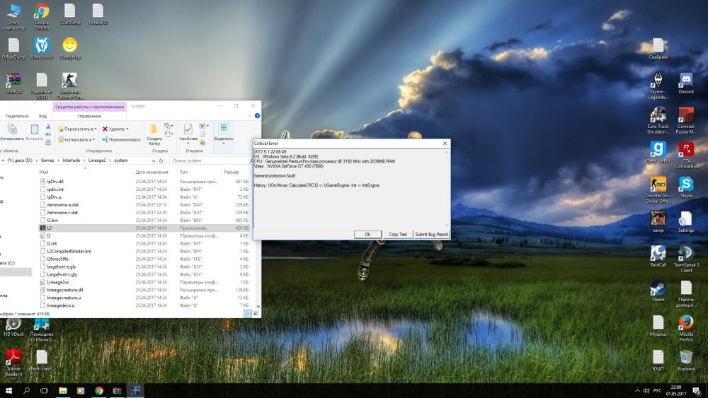 Переустанавливал игру около 5-6 раз всеми способами, отключал антивирусник, брандмауэр, добавлял игру в исключения. Итог - одна и та же проблема. Тупо крашит после окна запуска игры. 2017.5.1 22:03:24 OS : Windows Vista 6.2 (Build: 9200) CPU : GenuineIntel PentiumPro-class processor @ 3193 MHz with 2039MB RAM Video : NVIDIA GeForce GT 430 (7866) General protection fault! History: UOrcMove::CalculateCRC32 <- UGameEngine::Init <- InitEngine