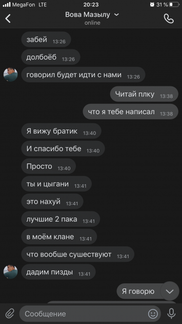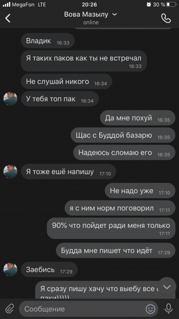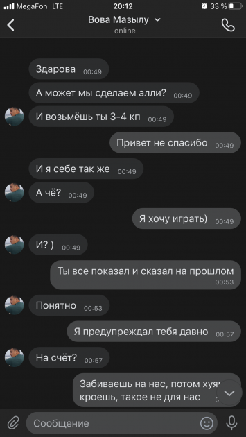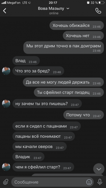 Да да, моим пакам пишет всякую дичь! Он даже своей квадратной головой не может понять, что мне все передают и со мной играют чисто мои паки! А теперь жду моих хейтеров, которые писали, что я пиздабол Вова никого не кидает)))