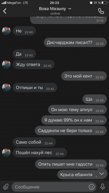какие же вы децики.. вы за своими недоплами вообще ниче не видите? Или вы полностью языком в очке у них? Эти ебланы пишут про меня посты и тд, я отвечаю. Я не терпила, чтоб читать всякую хуйню про себя и молчать. Но разница в том, что я рофлю с этого, даю пруфы, а вы сидите с пеной у рта.